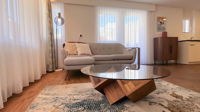 Viel Platz für zwei Personen bietet dieses komfortabel eingerichtete Apartment mit voll funktionstüchtiger Küche für Selbstversorger. Highlight hier ist die Doppeldusche mit WC. Die gemütliche Atmosphäre wird durch die gediegene Möblierung unterstützt. Ein Schlafzimmer mit Doppelbett und ein grosser Wohnbereich machen das Apartment mit 58 Quadratmetern zur Wohlfühlzone.